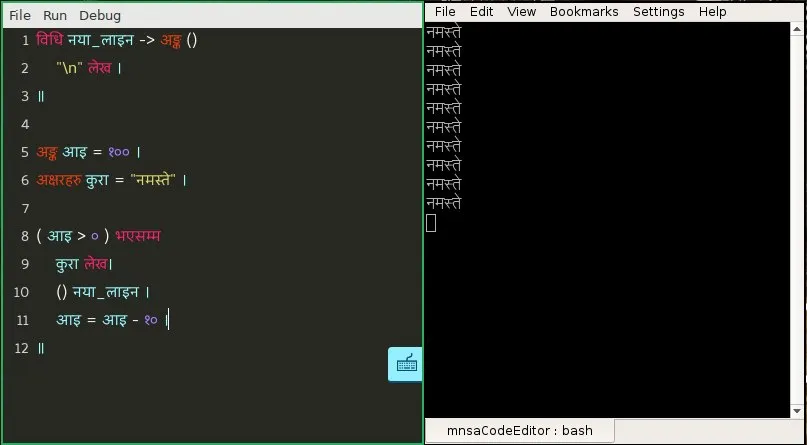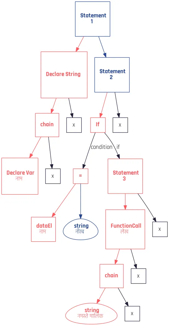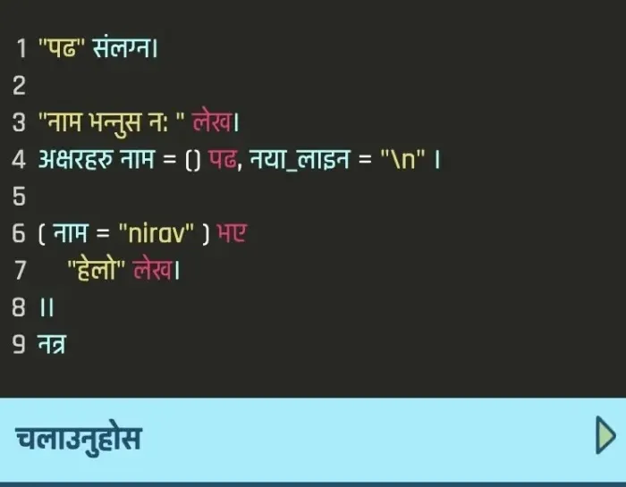 We have made a few changes to the conventional structure of a program statement to make it more expressive. For example, in function calls, the name of the function comes after the parameters, as verb comes at the end of sentence in Nepali. So "print Something" becomes "something लेख". We similarly modified other constructs such as conditionals and loops to fit into the Nepali grammar structure more. Technically, it is a very small change but it really does help make the programs more readable in Nepali. It was surprising how fluid the language becomes by changes so simple.